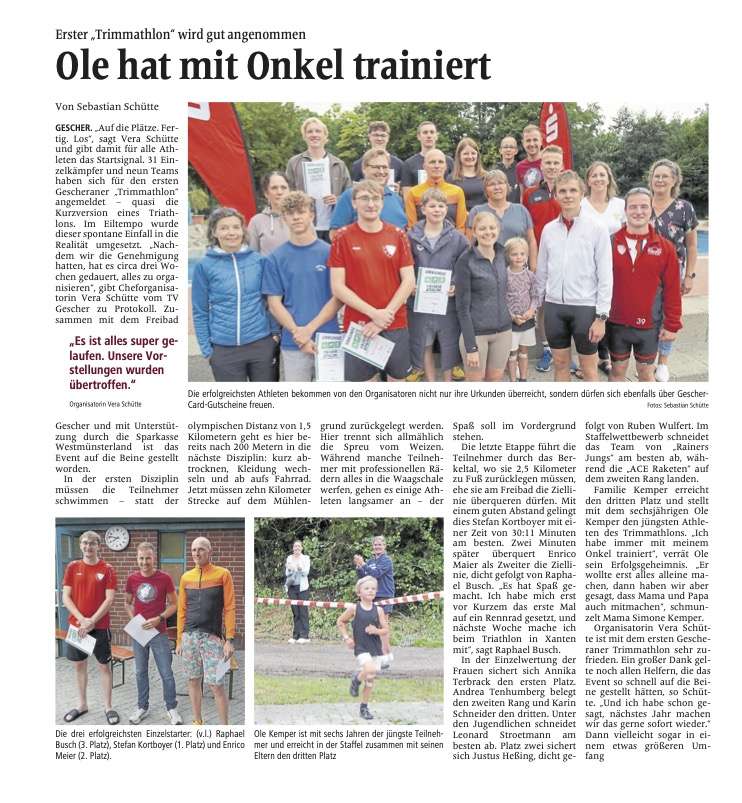 Am vergangenen Wochenende fand der allererste Trimmathlon des TV Gescher statt, und er war ein voller Erfolg! Insgesamt nahmen 31 Einzelteilnehmer und 9 Teams teil, darunter auch der jüngste Teilnehmer mit gerade einmal 6 Jahren, der mit seinem Onkel fleißig trainiert hatte. Die Distanz betrug 200 Meter Schwimmen, 10 Kilometer Radfahren und 2,5 Kilometer Laufen. Die Resonanz war überwältigend, und wir freuen uns schon auf eine Wiederholung im nächsten Jahr! 🎉
