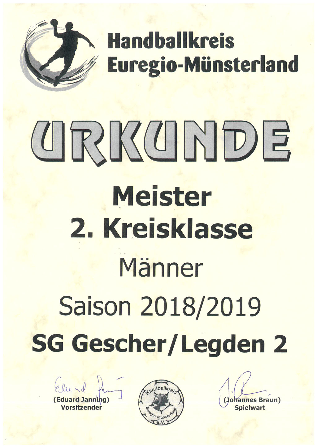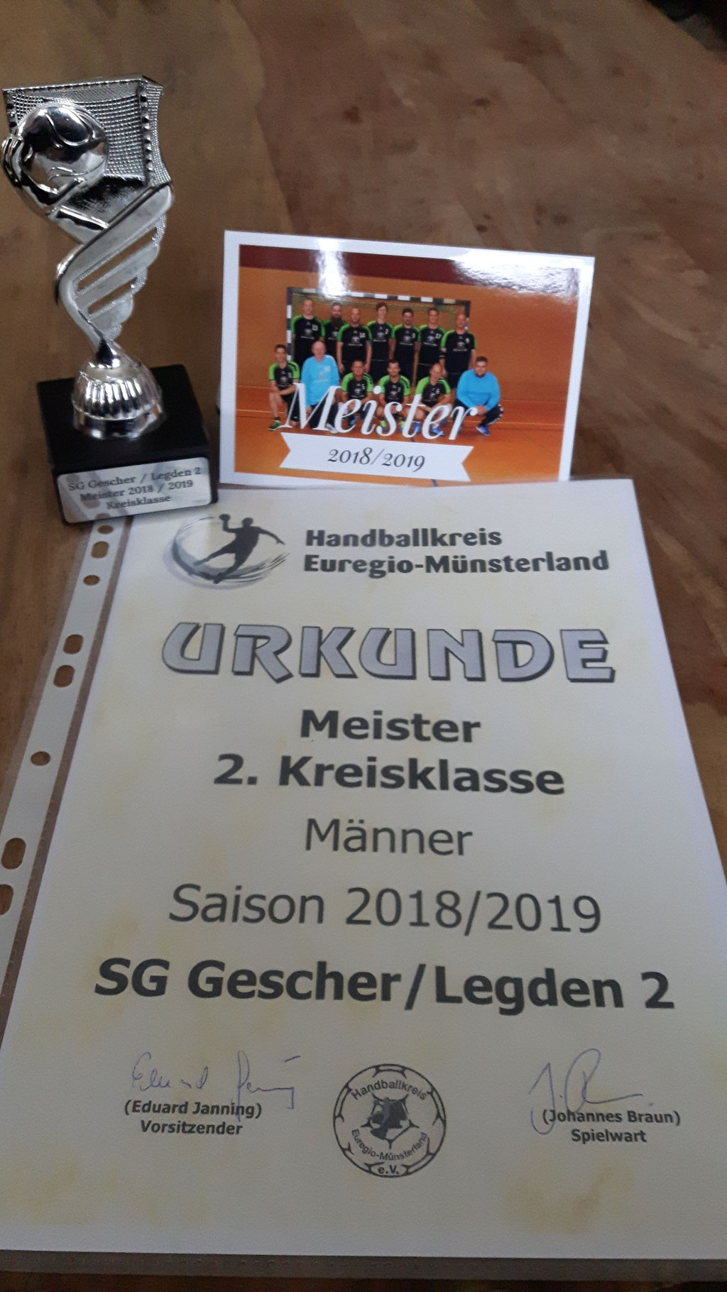 Gut Lachen haben die Handballer der SG Gescher / Legden II zum Ende der Saison 2018/2019. Auch ohne sich anzustrengen, machten sie die Meisterschaft und den Aufstieg perfekt, denn der letzte Gegner sagte die Begegnung kurzfristig ab. Mit nur sieben Minuspunkten führte man die Tabelle zum Saisonende souverän an. Auf der anstehenden Meisterfeier war man war sich einig: „Vorgeführt haben wir Sie“