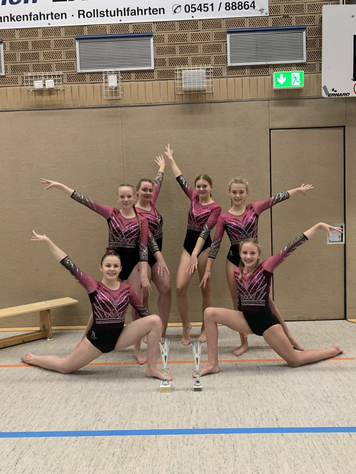 Mit 12 Turnerinnen ging der TV Gescher in diesem Jahr beim Münsterland-Cup in Ibbenbüren-Laggenbeck ins Rennen. Einmal mehr konnten die Gescheranerinnen überzeugen. Drei Turnerinnen erturnten sich den Meistertitel, ein weiterer Pokalgewinn mit Platz 3 sowie vordere Plätze in Podiumsnähe sind ein hervorragendes Ergebnis. Bei den 9-Jährigen konnte sich Mathilde Lassotta mit 48,50 Punkten und einem Vorsprung von 3,25 Punkten deutlich von der Konkurrenz absetzen und ganz oben auf dem Podium den wohlverdienten Pokal entgegennehmen. Dieses gelang auch Maria Thien, die an allen 4 Geräten einen soliden Wettkampf turnte (47,60 P.). Lene Kock erreichte hier mit 45,85 Punkten einen erfreulichen 4. Rang, Paula Lucas Rang 7 mit 45,10 Punkten. Den 3. Titelgewinn sicherte sich am Nachmittag Hannah Fiolka im Jahrgang 2009, die mit hohen 49,95 Punkten gemeinsam mit Liv Baron vom TuS Wüllen den Sprung aufs höchste Treppchen schaffte. Aufgrund der höheren Einzelwertung (13,25 P. am Boden) ging der Pokal in Gold trotz gleicher Gesamtpunktzahl an Hannah Fiolka. Nur knapp am Podium vorbei landete Julia Benning auf Rang 4 (48,70 P.). Rang 6 ging an Charlotte Höing mit 48,05 Punkten. Einen weiteren Pokal sicherte sich Theresa Thien. Sie erreichte im Jahrgang 2012 47,80 Punkte und damit Rang 3. Rang 5 ging hier an Lynn Kock mit 45,55 Punkten. Nike Knauer startete im Jahrgang 2006 u. älter und konnte mit ihrem 5. Rang überzeugen. Jule Kötting kam auf Rang 9 (Jahrg. 2013) und Lucie Klotzbach als Jüngere der Jahrgänge 2011/2012 auf Rang 21. Ende des Monats geht es dann für die Leistungsturnerinnen des TV Gescher um den Aufstieg in die Münsterlandliga 1 bzw. 2. Die Relegationswettkämpfe werden am 30. November in Mettingen ausgetragen.