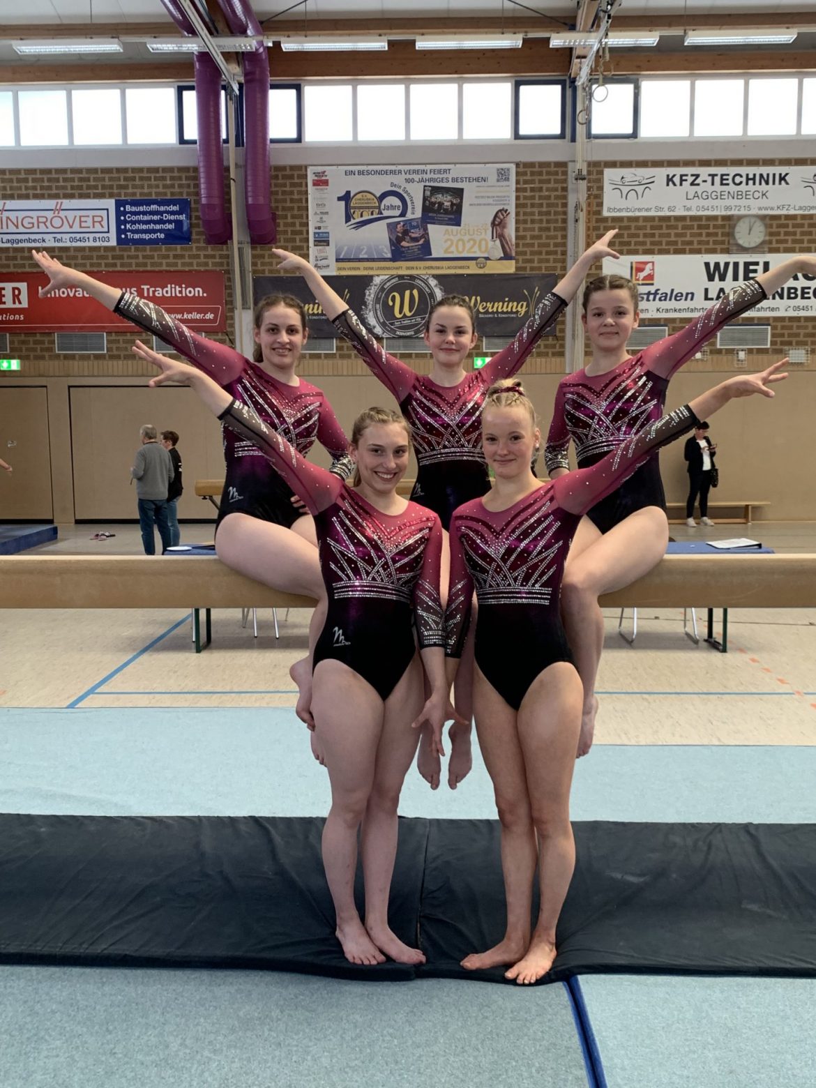 Nach dem vollzogenen Aufstieg im letzten Jahr starteten die 2 Mannschaften des TV Gescher am Samstag in Laggenbeck in der Hinrunde der Münsterlandliga 2 und 3. Dabei konnten beide Mannschaften vollends überzeugen. Im 1. Durchgang turnte TV Gescher 1 mit Mia Kallaus, Hannah Fiolka, Charlotte Rahn, Antonia Bednarz und Eva Schnieders in der Münsterlandliga 2. Trotz des Ausfalls von Charlotte Höing gelang es der Mannschaft, sich mit 151,90 Punkten und einem Rückstand von nur 0,85 P. auf Rang 2 hinter der SG Coesfeld zu behaupten. Eva Schnieders kam an 2 Geräten zum Einsatz und konnte hier jeweils den 1. Rang in der Einzelwertung erzielen. Am Sprung teilte sie sich den Sieg mit Marie Kockmeyer von der KTS Mettingen (beide 12,60 P.), Am Barren reichten 12,90 P. zum Einzelsieg gemeinsam mit Clara Knappmann von der Westfalia Buer. Antonia Bednarz erturnte am Barren Rang 2 (12,75 P.) gemeinsam mit 2 Turnerinnen der SG Coesfeld. Unangefochten zelebrierte Charlotte Rahn ihre Balkenübung, die mit 13,20 Punkten und Rang 1 belohnt wurde. Charlottes Bodenübung war ein weiteres Glanzstück. 13,45 Punkte brachte sie hier auf Rang 3. Am Nachmittag startete dann die 2. Mannschaft mit Nike Knauer, Julia Benning, Judith Brüning, Lucy Drögehoff und den beiden Youngsters Lynn Kock und Theresa Thien in der Münsterlandliga 3. Nike Knauer legte am 1. Gerät, dem Balken, den Grundstein mit ihrer sicher vorgetragenen Übung (12,15 P.). Die weiteren Turnerinnen folgten diesem Beispiel und sammelten hier ohne einen Absteiger zu verbuchen bereits 37,00 Punkte. Auch im weiteren Verlauf ließ die Mannschaft am Boden, Sprung und Barren nichts mehr anbrennen und konnte sich letztendlich mit 147,90 Punkten und einem Vorsprung von 0,85 Punkten vor dem TV Ibbenbüren auf Rang 1 behaupten. In der Einzelwertung siegte Theresa Thien mit 49,20 Punkten. Auch der 2. Rang ging mit Julia Benning (49,10 P.), die darüber hinaus auch am Sprung Rang 2 erreichte, an den TV Gescher. Weitere hearausragende Einzelleistungen erzielten Judith Brüning am Sprung (Rang 3, 12,50 P.), Lucy Drögehoff mit Rang 2 (12,50 P.) und Theresa Thien mit Rang 3 (12,30 P.) am Balken. Die Rückrunde findet am 7. September in Coesfeld statt.