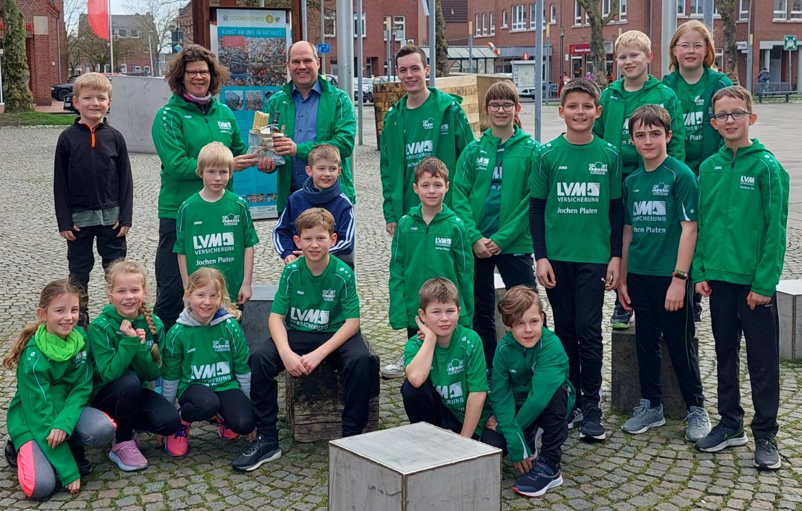Die Leichtathleten des TV Gescher durften sich auch in diesem Jahr wieder über ein Sponsoring ihrer Trikots durch Jochen Platen (hinten 3. vl) – LVM Geschäftsstelle Gescher – freuen. Sonja Lüdiger (hinten 2. vl)  – Trainerin der Leichtathletikabteilung – bedankt sich mit einem Präsent.